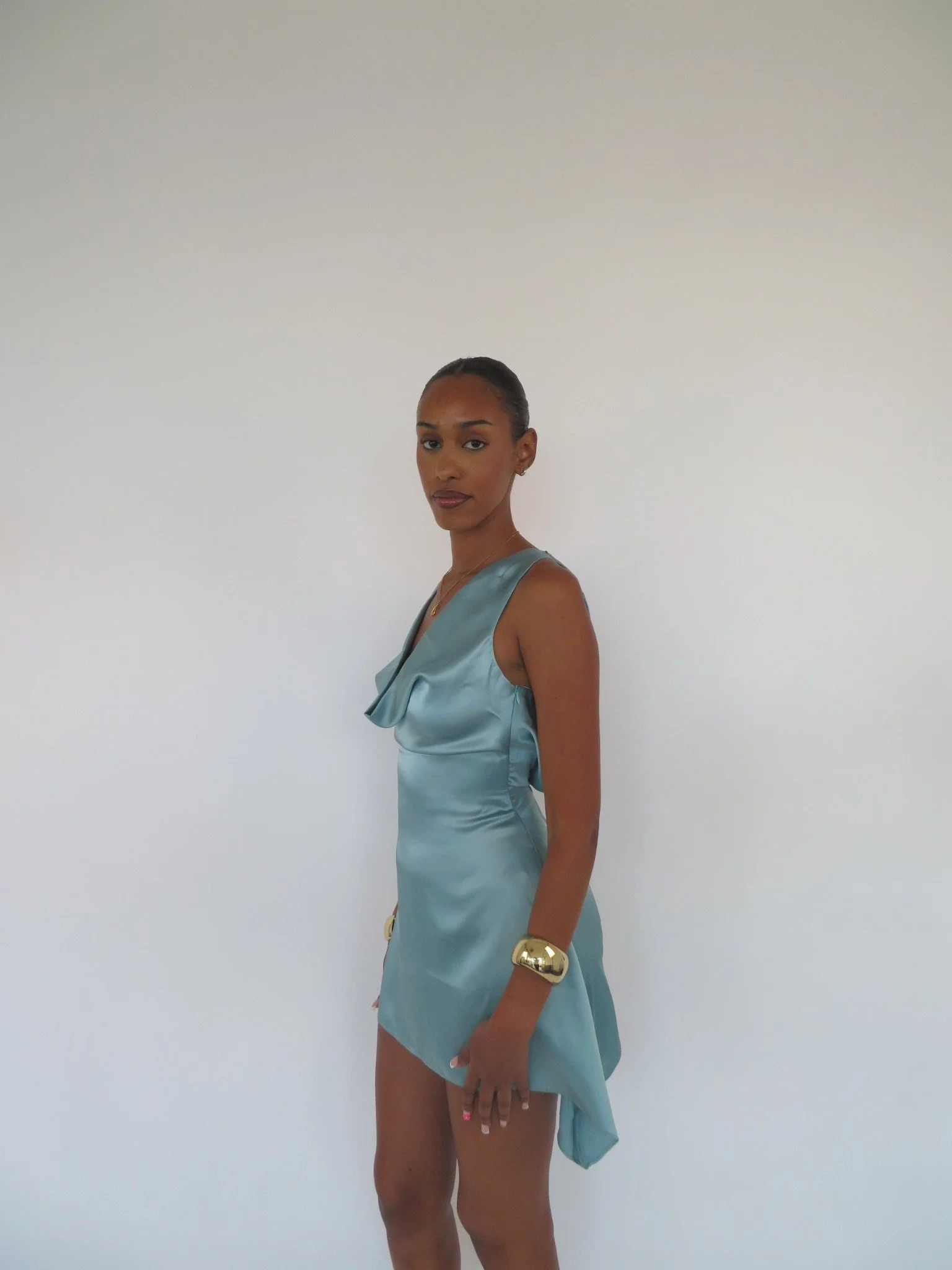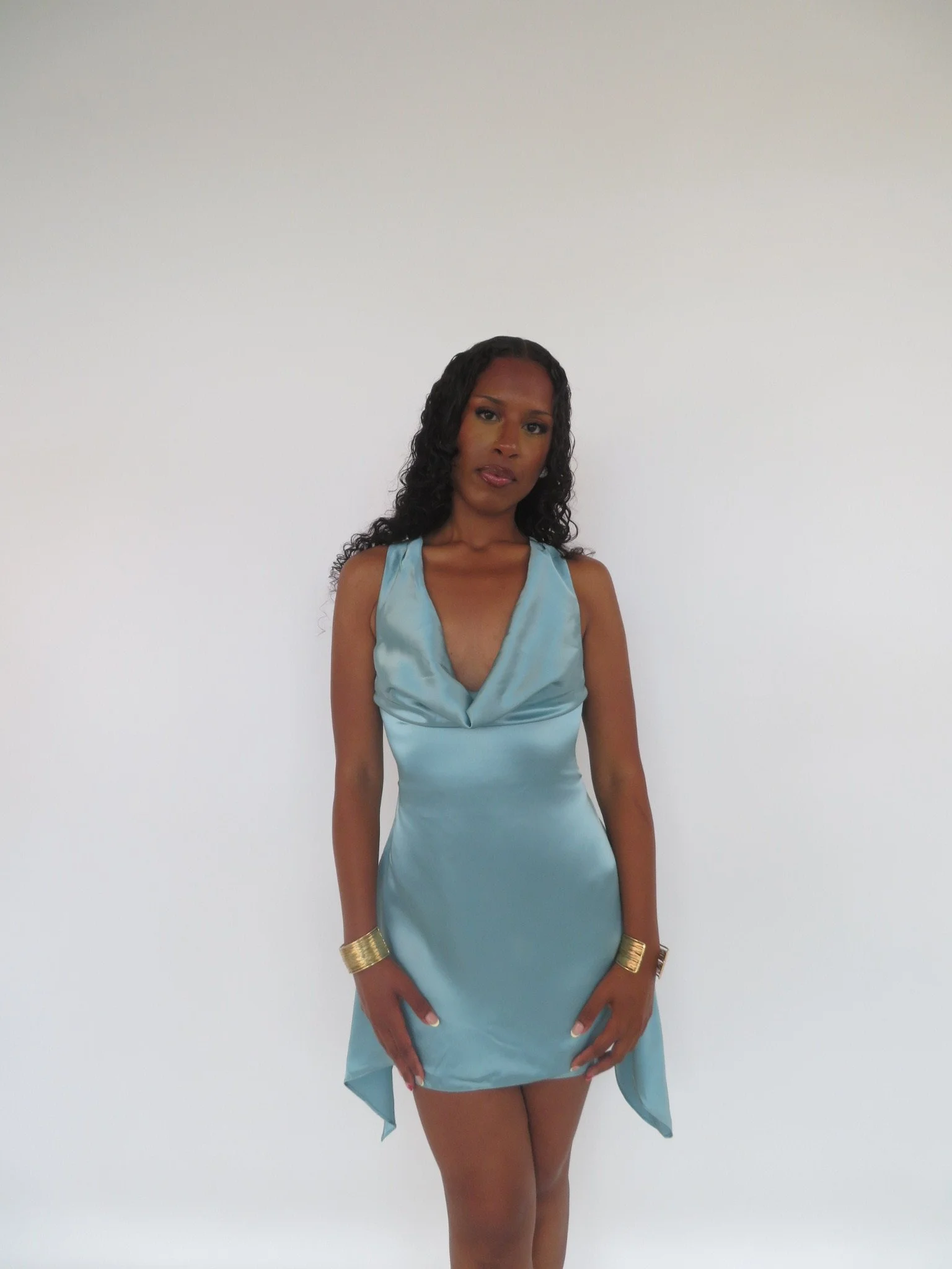 This sky blue satin mini dress drapes effortlessly over the body, catching light with every movement. Featuring a clean silhouette and subtle sheen, it is the perfect balance of minimal and statement. Pair it with strappy heels for a dreamy summer night, or dress it down with sandals for a daytime glow.